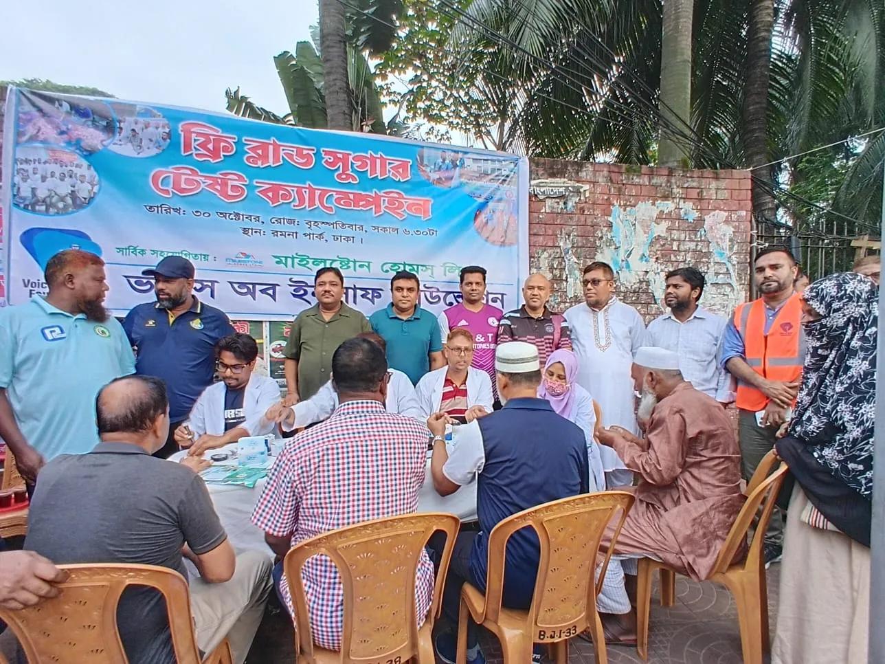 আজ ৩০ অক্টোবর রোজ বৃহস্পতিবার সকাল ৬:৩০ মিনিটে রমনা পার্কের মৎস ভবন গেইটে Voice of Insaf Foundation এর উদ্যোগে ফ্রি ব্লাড সুগার টেস্ট ক্যাম্পেইন অনুষ্ঠিত হয়। নির্বাহী সদস্য জনাব আব্দুর রহমানের সঞ্চালনায় প্রধান অতিথি হিসেবে উপস্থিত ছিলেন বিশিষ্ট ব্যবসায়ী ও Voice of Insaf Foundation এর সম্মানিত চেয়ারম্যান জনাব MD Aminul Islam , বিশেষ অতিথি হিসেবে উপস্থিত ছিলেন @যুব উন্নয়ন সংস্থা ঢাকা এর সভাপতি ও ভয়েস অব ইনসাফ ফাউন্ডেশন এর নির্বাহী পরিচালক জনাব Md Mojibur Rahman, মাইলস্টোন হোমস লিমিটেডের সম্মানিত ম্যানেজিং ডিরেক্টর জনাব এস এম আল হেলাল, Voice of Insaf Foundation এর সম্মানিত ভাইস চেয়ারম্যান জনাব আবু নোমান মোঃ আব্দুল বাছেদ, বিশিষ্ট ব্যবসায়ী জনাব নজরুল ইসলাম মজুমদার। উক্ত প্রোগ্রামে আরো উপস্থিত ছিলেন ফাউন্ডেশন এর নির্বাহী সদস্য জনাব এনামুল হক, ফজলুর রহমান মিরাজসহ স্বেচ্ছাসেবক নেতৃবৃন্দ।